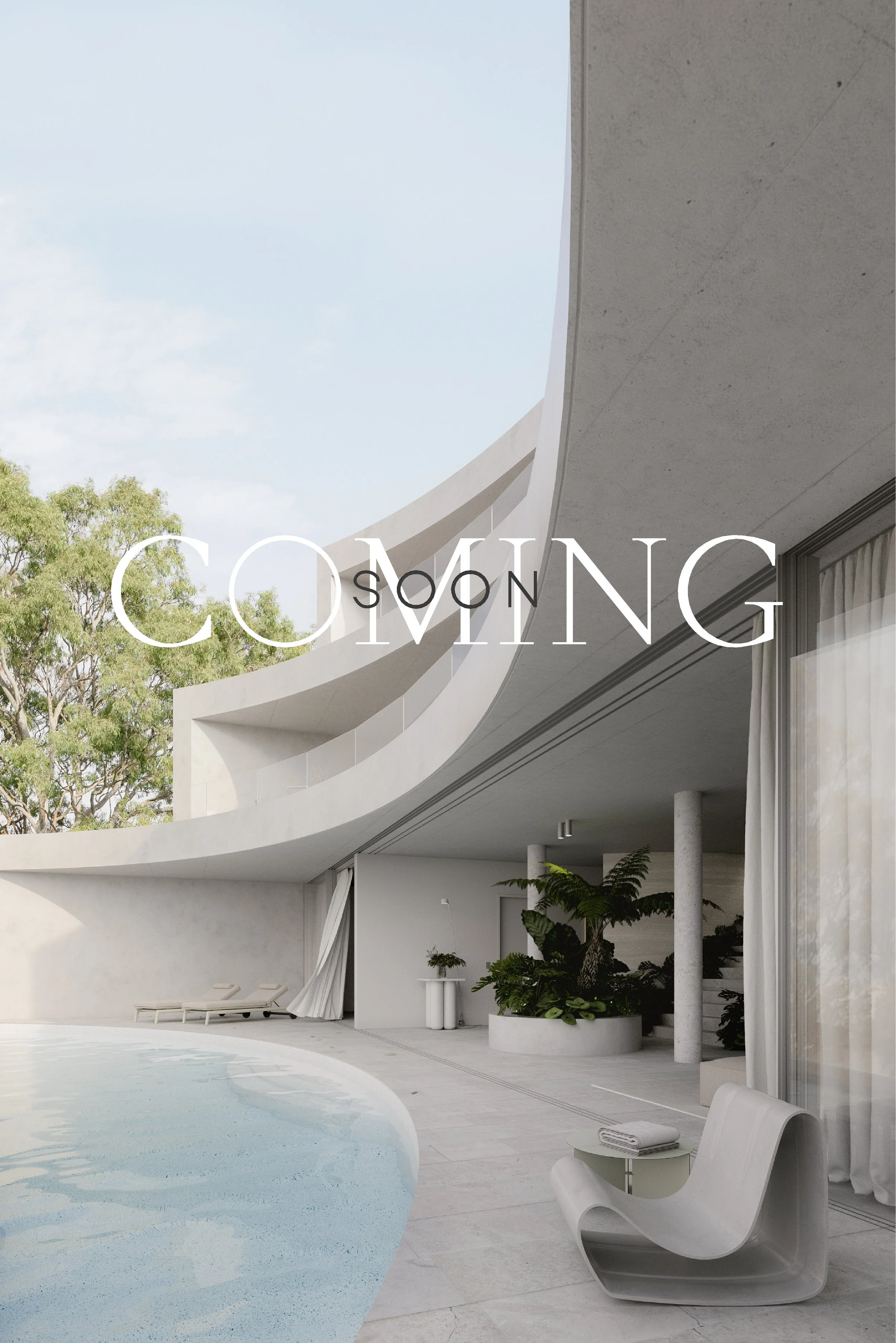 Modern contemporary minimalist timeless house with curved balcony, poolside lounge, and lush plants, with overlay text 'Coming Soon'.